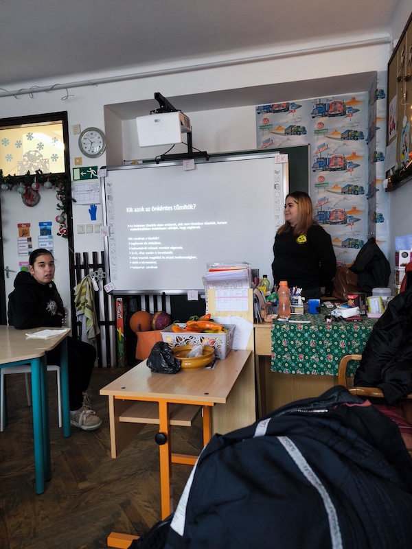 A közös fotózás után tanteremben folytattuk a tűzvédelmi felvilágosító munkánkat, mely rendkívül jó hangulatban, konzultálva a diákokkal zajlott le.